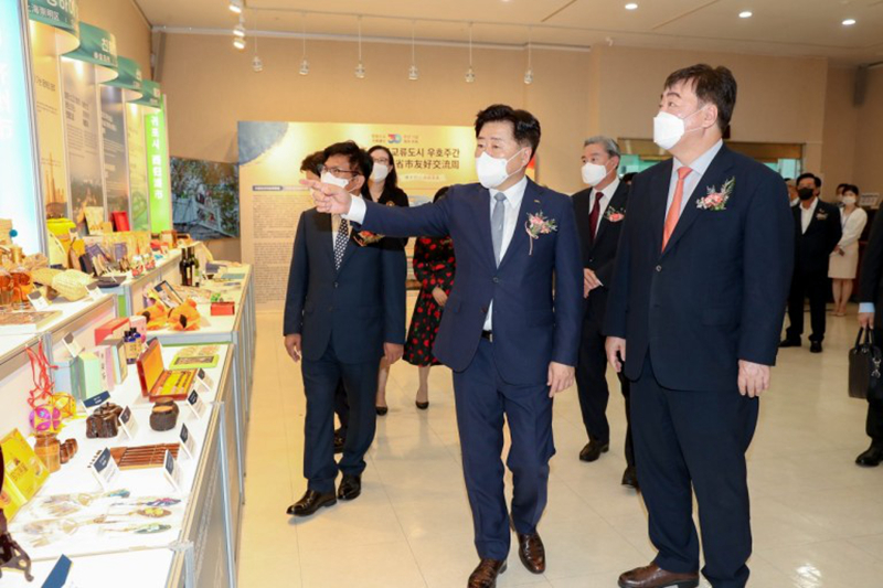 中国驻韩国大使邢海明、济州道知事吴怜勋观看“济州-中国省市友好交流周”济州及友好省市特产展示。