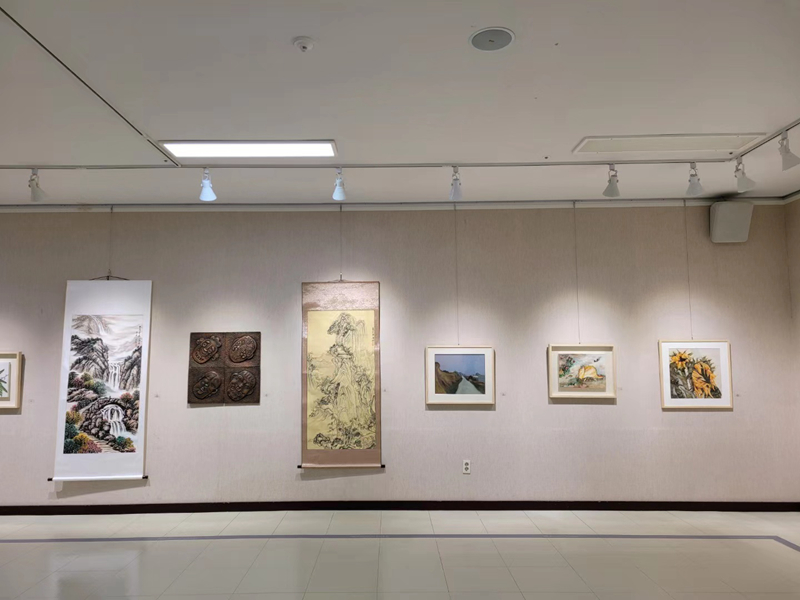 我市选送的绘画作品《秋山行旅》(左3)参加“济州-中国省市友好交流周”残疾人艺术作品交流展。