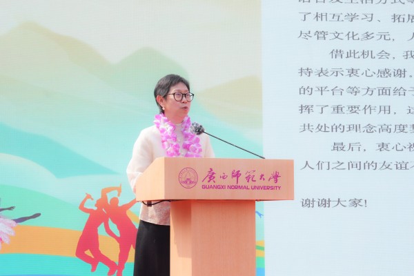 泰王国驻南宁总领事馆副总领事谭诺兰在开幕式上致辞,对学校长期以来在教育培养、生活保障等方面给予泰国师生的周到服务表示高度认可与感谢。她指出,国际文化节既是各国文化多样性的生动展示,更是促进中外理解、深化友谊与协作的重要桥梁,祝愿本届国际文化节圆满成功,两国友谊万古长青。